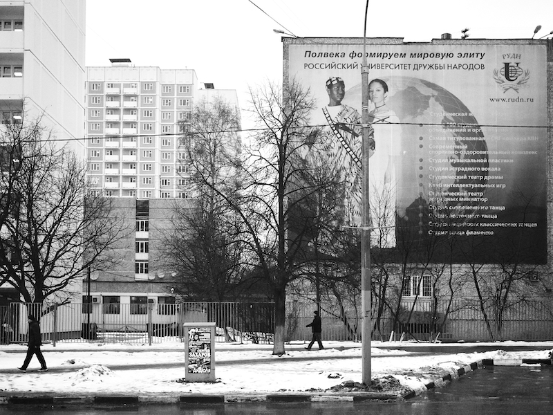 Ym Mosco mae hi’n oer; does neb yn gwenu arno ac mae’n cael yr awyrgylch yn fygythiol. Cysur yw dwyn i gof y cyfnod Sofietaidd a datganiad Paul Robeson mai dyma’r lle cyntaf erioed iddo gael ei drin fel bod dynol, ac nid fel negro. Yn y 1960au sefydlwyd Prifysgol Lumumba yn arbennig i hyfforddi myfyrwyr tlawd y Trydydd Byd ac mae’r brifysgol yn dal yno, wedi newid ei henw a’i hideoleg bellach. ‘Hanner canrif o baratoi’r elît rhyngwladol’ dywed y murlun yn y llun ar y chwith, ac nid ieithwedd gomiwnyddol mo hynny. Yno yr aiff Johny Pitts i ganol myfyrwyr du er mwyn eu holi am eu profiad o hiliaeth, ond prin bod neb am siarad ag ef. Maent am fanteisio ar addysg rad a mynd adref. Nid Affropeaid mohonynt ond Affricanwyr ar ymweliad. Am fynd adref y mae Johny Pitts hefyd: ‘I felt stranded, even among the black students. I also felt as Western European as I ever have, and couldn’t wait to leave.’ Perthyn bydolwg Johny Pitts i’r triongl rhwng gorllewin Ewrop, Gorllewin Affrica a gwledydd caethwasiaeth y Caribî ac America. Gwladwriaeth imperialaidd oedd Rwsia hefyd, yn amser y Tsar a Chomiwnyddiaeth. Eu ‘duon’ hi heddiw, sy’n gweithio ym Mosco am y nesaf peth i ddim ac yn cysgu’n ddeg mewn un ystafell, yw’r Tadsiciaid a’r Cirgisiaid a phobl o fynyddoedd y Cawcasws. ‘Nhw,’ medd rhywun wrth Pitts, ‘sy’n dod yma ac yn mynd â’n swyddi.’
