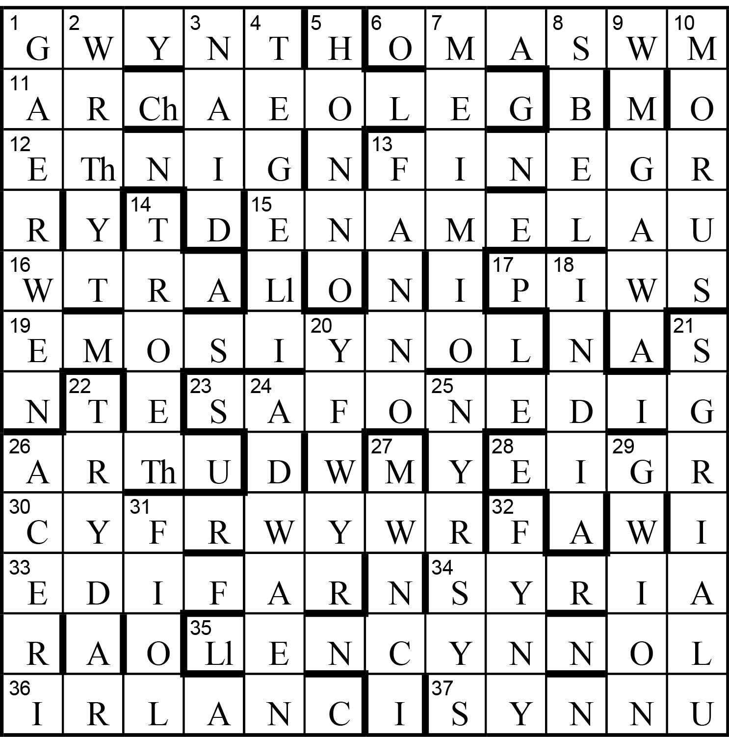 Ymddengys enw'r diweddar annwyl GWYN THOMAS yn y sgwariau o 1 i 8.
