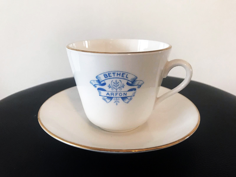 Mae ’na ymyl aur ar y gwpan, twtsh o aur ar y glust hefyd a rhimyn aur o amgylch y soser. Fel arall, does ’na ddim yn torri ar y purdeb gwyn ond stamp glas golau sy’n cynnwys dwy sgrôl rubanog a motiff deiliog. Ac enw bob un ar y ddwy sgrôl, sef Bethel / Arfon.