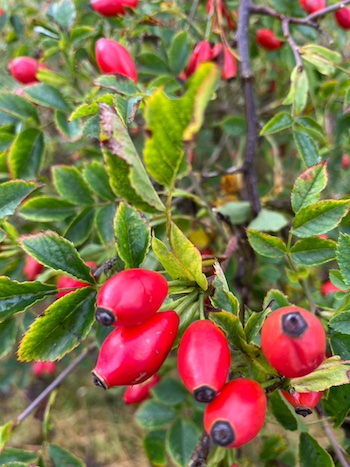 Ar hyn o bryd, mae’r llwyni yn orlawn. Awn at lwyn rhosyn gwyllt, fy ffefryn. Mae rhai’n dyllog lle bu cacwn yn gloddesta. Rhai’n wyrddfelyn, eraill yn goch ac yna’n ddu. Mae un rhosyn eiddil yma, hyd yn oed. Mewn un man, cynrychiolir bron bob tymor. Dim ond bygythio mae’r gaeaf hyd yma. Miri tri glöyn byw sydd wrth swmp arall o egroes, un yn dal yn dynn wrth egroesen fel petai’n ei marchogaeth neu’n gwrthod ei gollwng i’n dwylo ni.