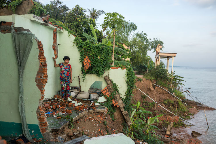 Ha Thi Be, 67 oed, yn ei chartref teuluol, a ddisgynnodd i’r Mekong yn Ionawr 2017 / Sim Chi Yin