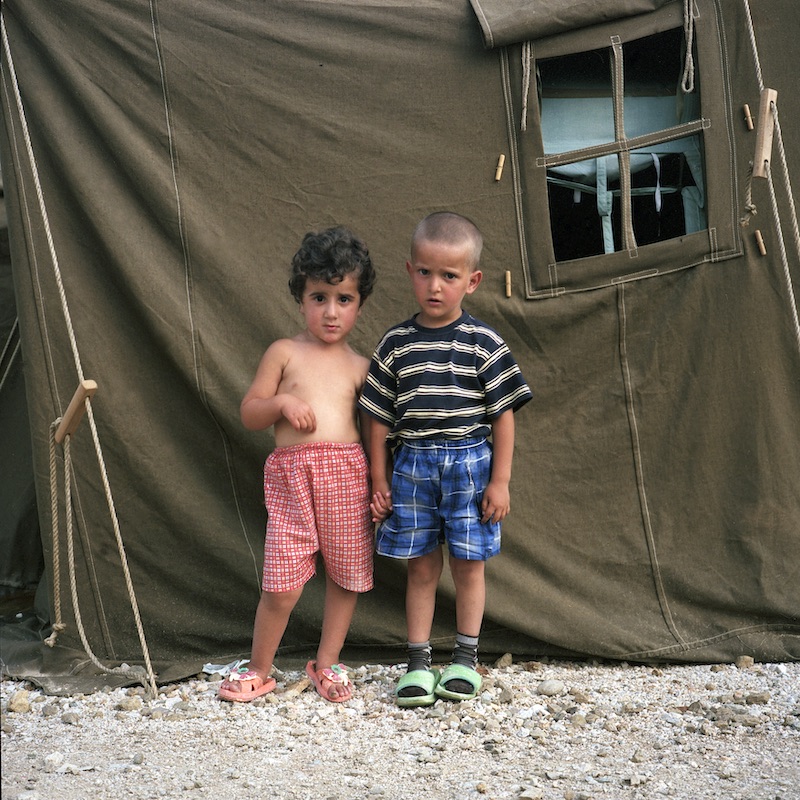 Fis Mai a Mehefin y flwyddyn honno treuliodd y ffotograffydd Melanie Friend ddeng niwrnod yng ngwersyll Neprošteno. Yng nghwmni cyfieithwyr lleol bu’n siarad am oriau ‘efo pobl roeddwn i’n medru teimlo cysylltiad efo nhw – roedd eu llygaid dwys yn pefrio’. Magwyd digon o ymddiriedaeth rhyngddynt nes y cytunodd mam Vlora a thad Fatjon iddi hi dynnu portreadau o’u plant.
